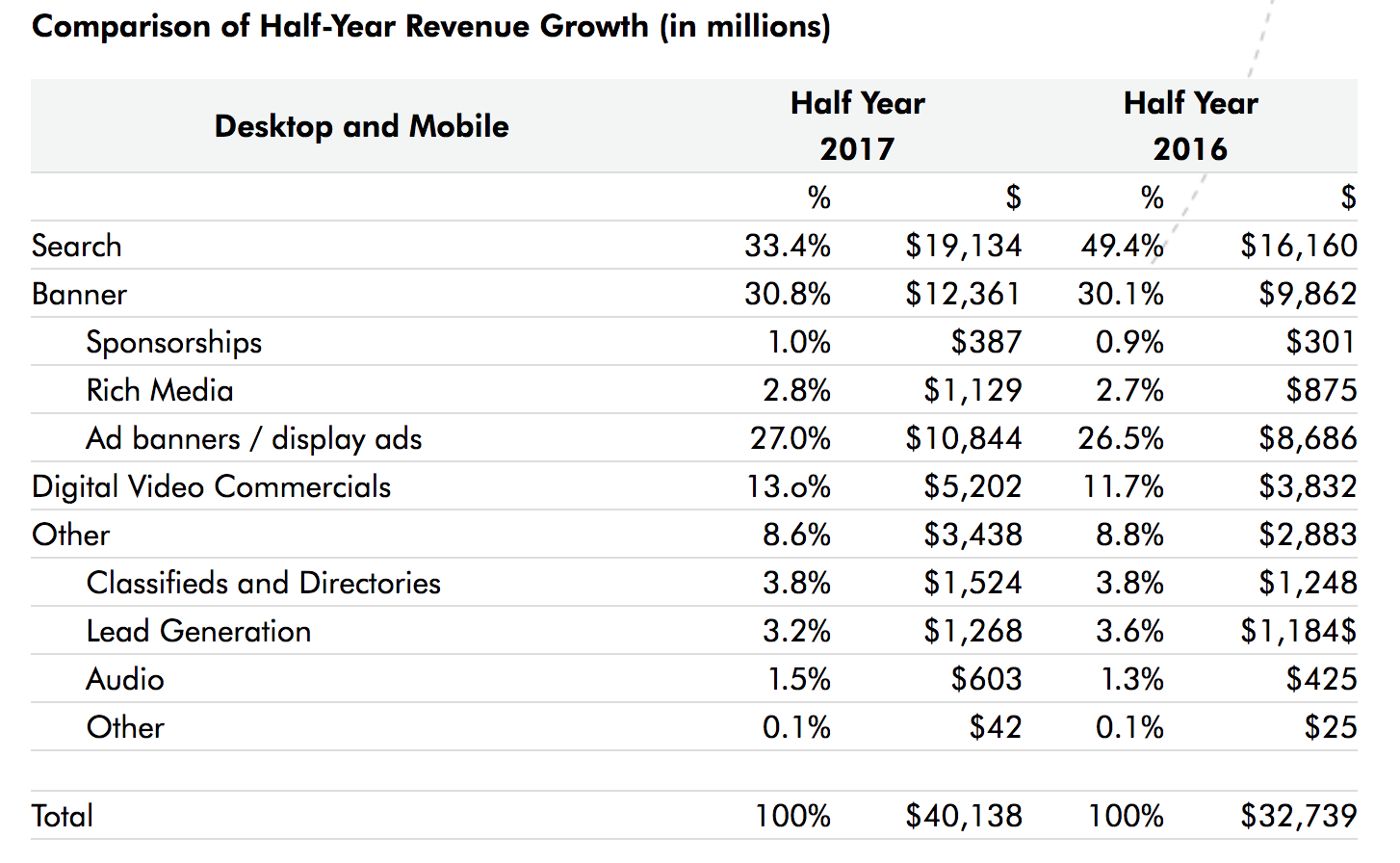- Total digital video, including mobile and desktop, rose to $5.2 billion in HY 2017, up 36% from $3.8 billion in HY 2016;
