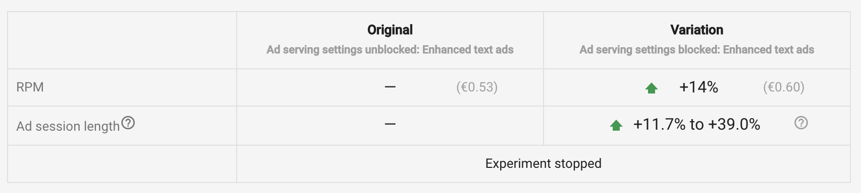"Ad session length measures change in ad queries per session. If the variation has longer sessions, it's a good sign that users spend more time on your site and may have a better experience. In the case of neutral metrics, the impact is negligible and it's recommended that you look at other metrics to choose the winning experiment setting."