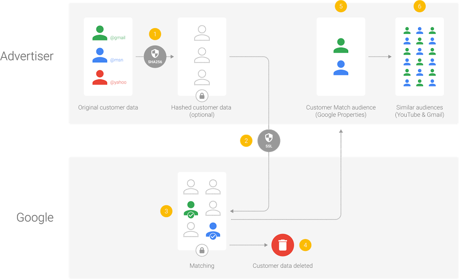 In Adwords, advertisers need to upload "customer data already hashed using the SHA256 algorithm, or, data in plain text." If there's a match, we add the corresponding Google account, the user is added to the Customer Match audience.