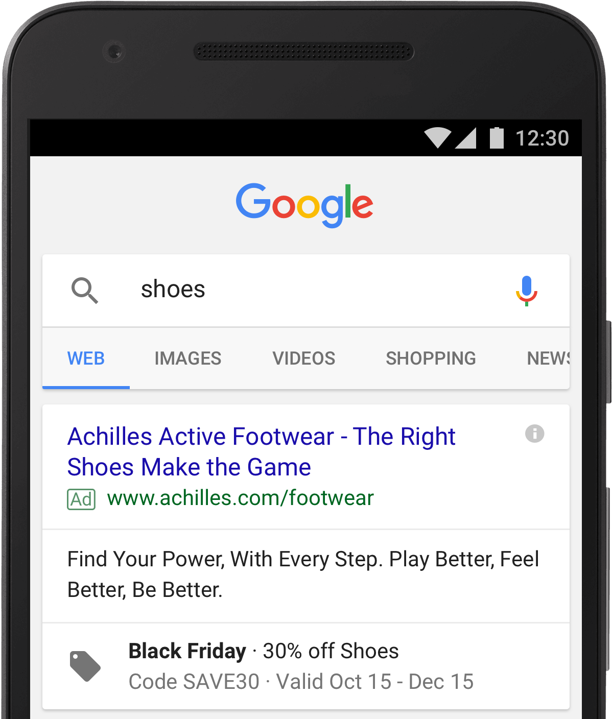 An example: if you have a shoe store: "you might use promotion extensions to show a “30% off” promo code on all Black Friday orders. You can also make these types of seasonal offers more prominent in your ad by selecting one of 12 occasions, like Black Friday or Back-to-school."
