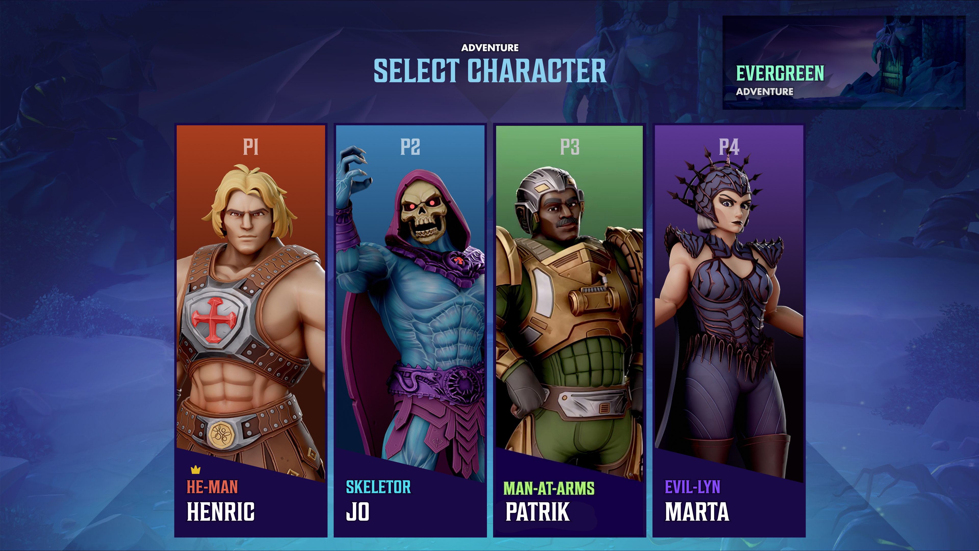 Four character slots appear in published screenshots: He-Man (named Henric), Skeletor (named JD), Man-At-Arms (named Patrik), and Evil-Lyn (named Marta). The character select screen indicates up to four simultaneous players, reinforcing the couch co-op framing. A map interface visible in promotional materials - labeled "Evergreen" - shows a branching node structure consistent with roguelike progression design, where players chart routes across interconnected decision points rather than following a fixed linear path.