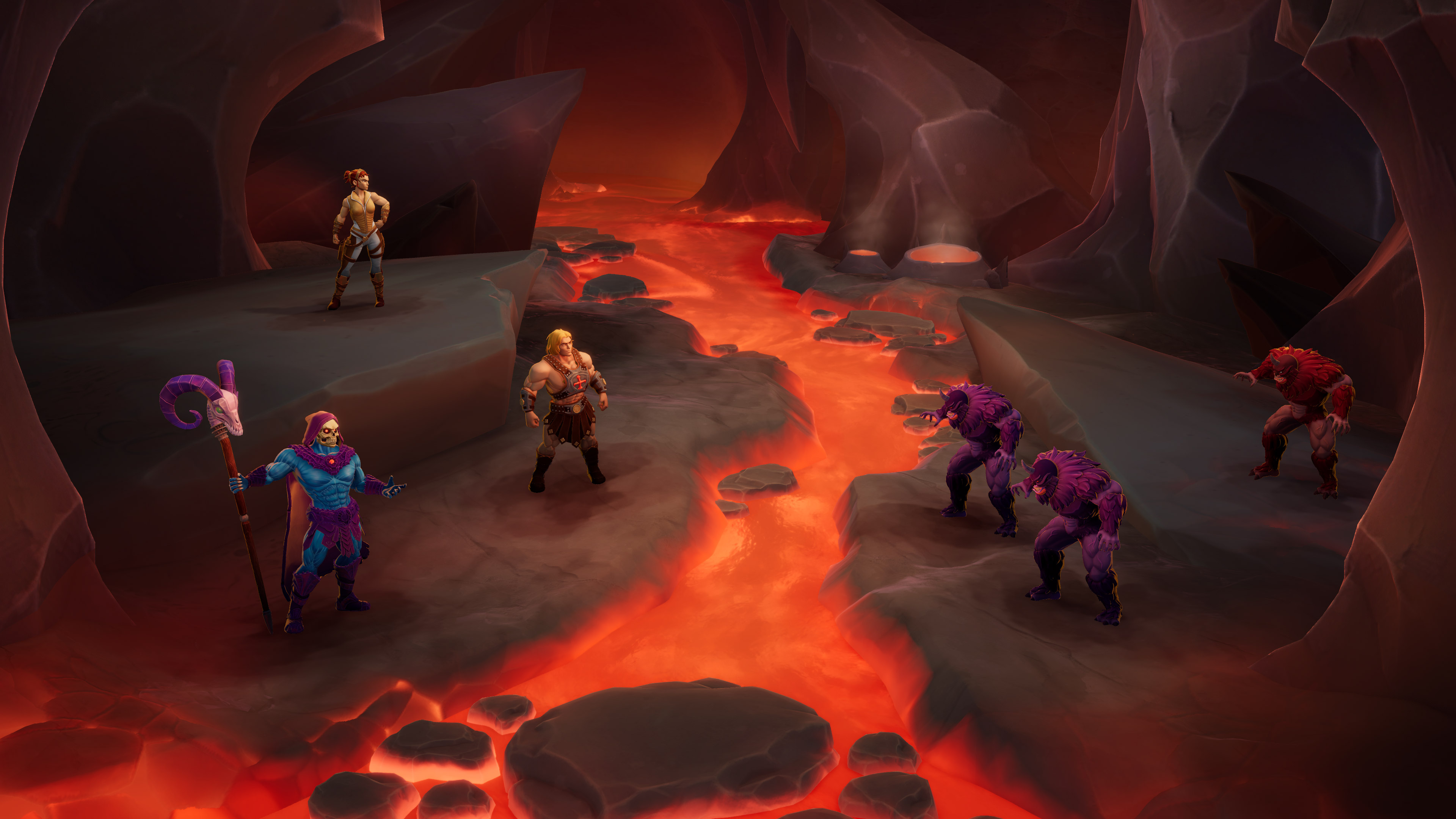 In Adventure Mode, the announcement describes a system where players deliver larger hits, accumulate increasingly powerful cards, and progressively strengthen their chosen characters. The game features multiple biomes, each presenting distinct challenge configurations. Enemies drawn from Eternian lore include Hordak - identified in the materials as Skeletor's former mentor - alongside environmental hazards such as Moaty, described as a gaze-based threat, and unnamed boulder sequences. The villain roster extends established Masters of the Universe mythology while incorporating characters introduced by the 2026 film.
