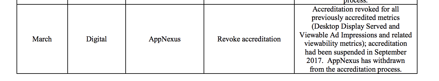 MRC just revoked the accreditation from AppNexus. According to the Media Rating Council Accreditation Updates, January through March 2018, AppNexus accreditation was "revoked for all previously accredited metrics (Desktop Display Served and Viewable Ad Impressions and related viewability metrics); AppNexus has withdrawn from the accreditation process."