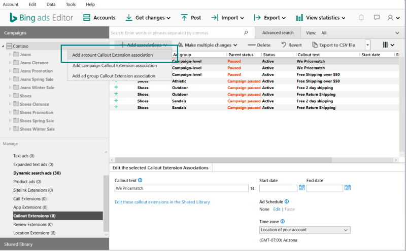 How to do it: To associate an ad extension shared library to your account, click on the Add associations button and choose the option to add account level ad extension and follow the prompts.