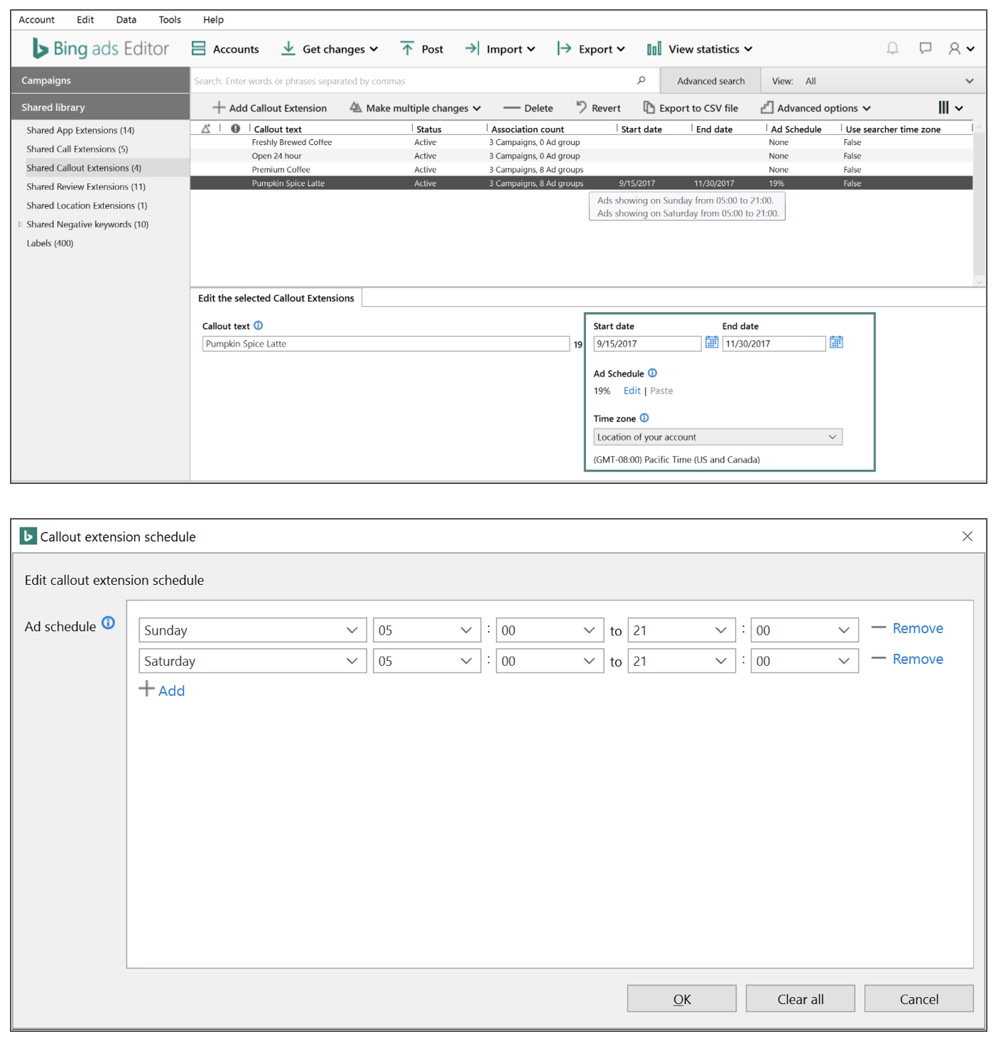 On Bing Ads Editor, advertisers can now control the date range, days of the week, and time of the day of when your ad extensions are displayed. The schedules can be based on your account time zone or the time zone of the person viewing your ads.