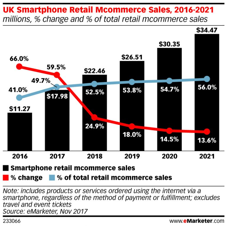 In 2017, for the first time, UK retail ecommerce purchases made via smartphone will overtake tablets, according to eMarketer’s latest retail ecommerce forecast. This year, UK retail ecommerce purchases made by using a smartphone will be worth nearly £18 billion, representing a 49.7% share of all retail mcommerce sales. By comparison, purchases made via tablet will account for 49.4% of mobile outlays, with the remaining, fractional portion assigned to sales made via feature phone. By 2021, retail ecommerce purchases made via smartphone sales will represent 56.0% of ecommerce sales.