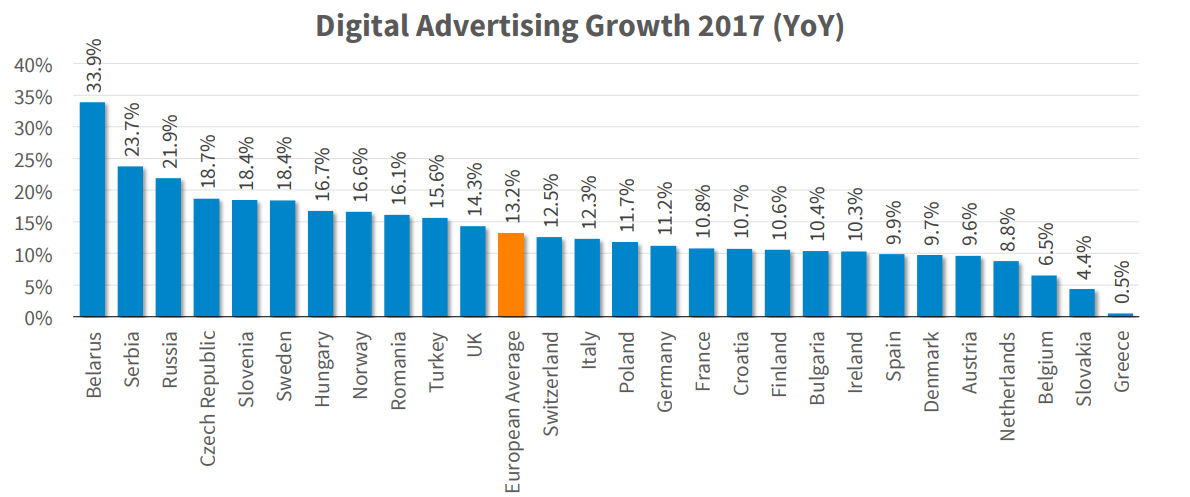 In 2017 the digital advertising market grew 13.2%. The market size of UK is still 2 times bigger the German, and is as big as France, Russia and Germany combined.