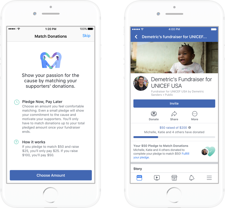 Fundraisers will also be able to match donations. Facebook says "this is a first of its kind tool in online fundraising that’s now available in the US and will soon expand internationally." Here the example: