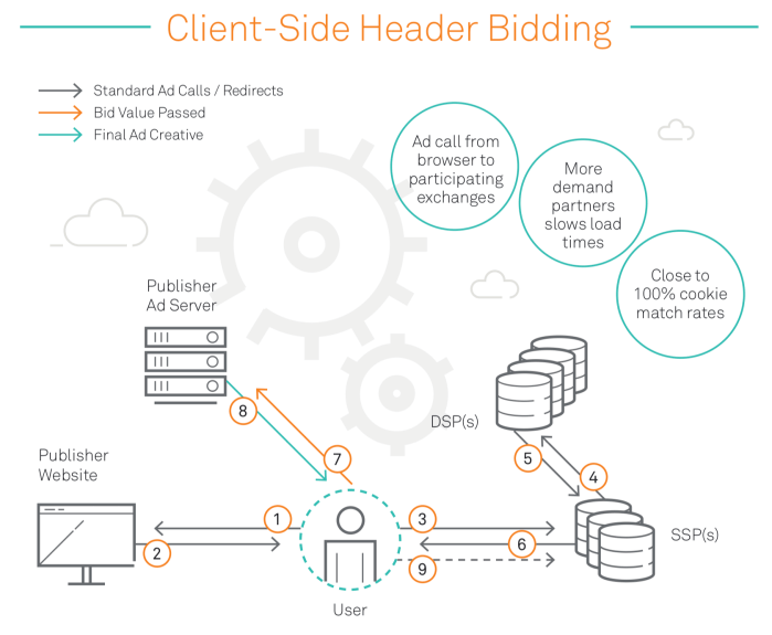 On the Client Side Header Bidding, the auction happens on the user's browser. The Ad call goes from the browser to participating exchanges (SSP's), and then to the DSP's. The best value of the Client Side Header Bidding is that the cookie is dropped on the browser, so the cookie match rates are close to 100%. However, there is a disadvantage: more demand partners will slow load times of the ads.