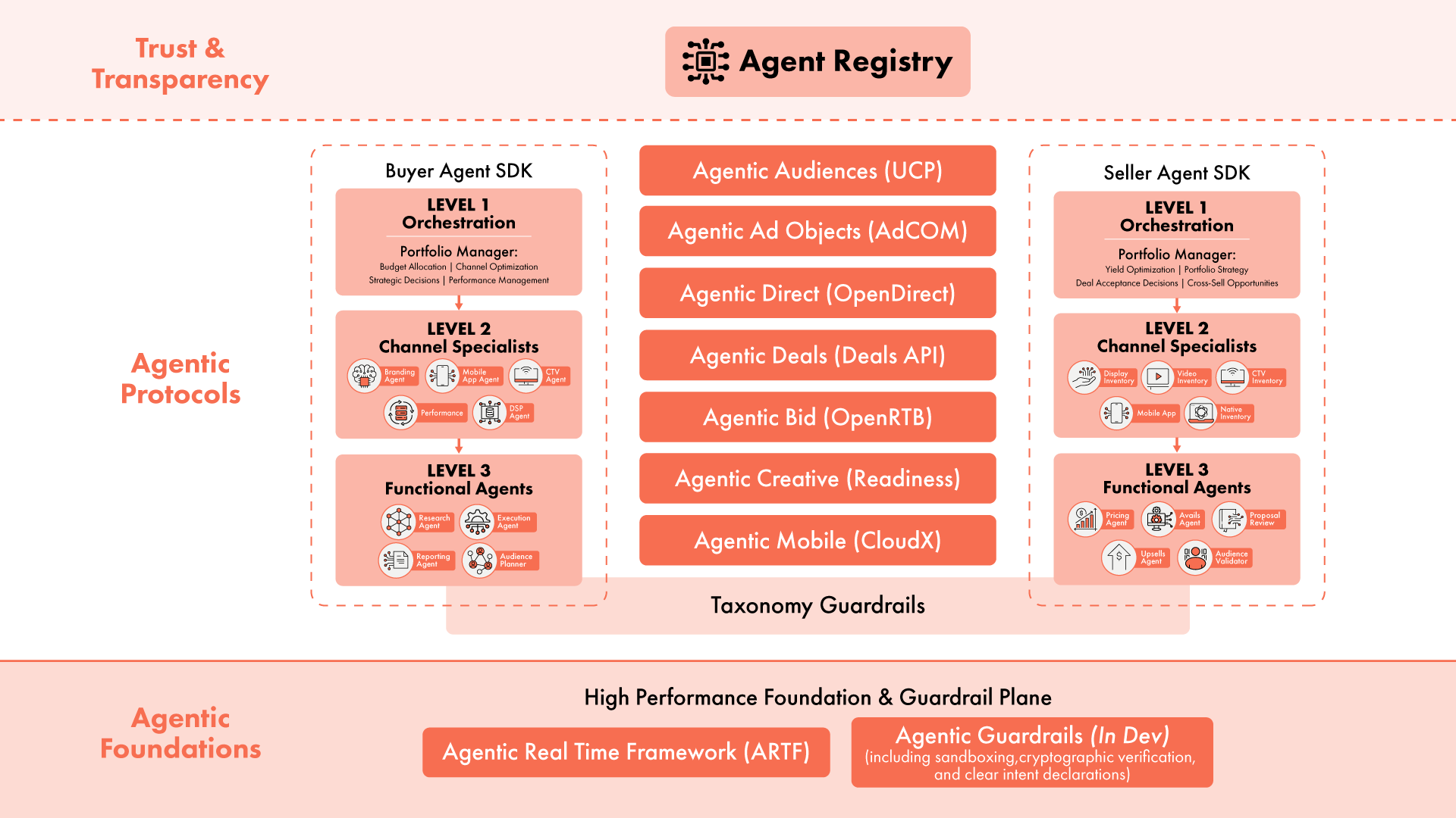Both the buyer and seller hierarchies are enclosed within a single band labeled Taxonomy Guardrails - a constraint layer sitting beneath Level 3 and above the Agentic Foundations. Taxonomy guardrails ensure that agents at any level use standardized vocabularies rather than platform-proprietary definitions, which is essential for buyer and seller agents to understand each other without ambiguity. IAB Tech Lab's existing taxonomy infrastructure - covering ad products, content, audiences, and privacy - underpins this layer.