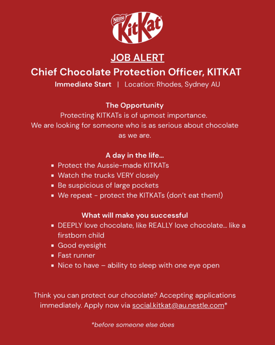 KitKat ANZ - the Australia and New Zealand account - posted a job listing for a Chief Chocolate Protection Officer. According to the post, requirements included a deep love for chocolate, good eyesight, the ability to run fast, and the capacity to sleep with one eye open. Responsibilities listed included watching trucks closely and being suspicious of large pockets. The post received 40,857 likes at the time of writing.