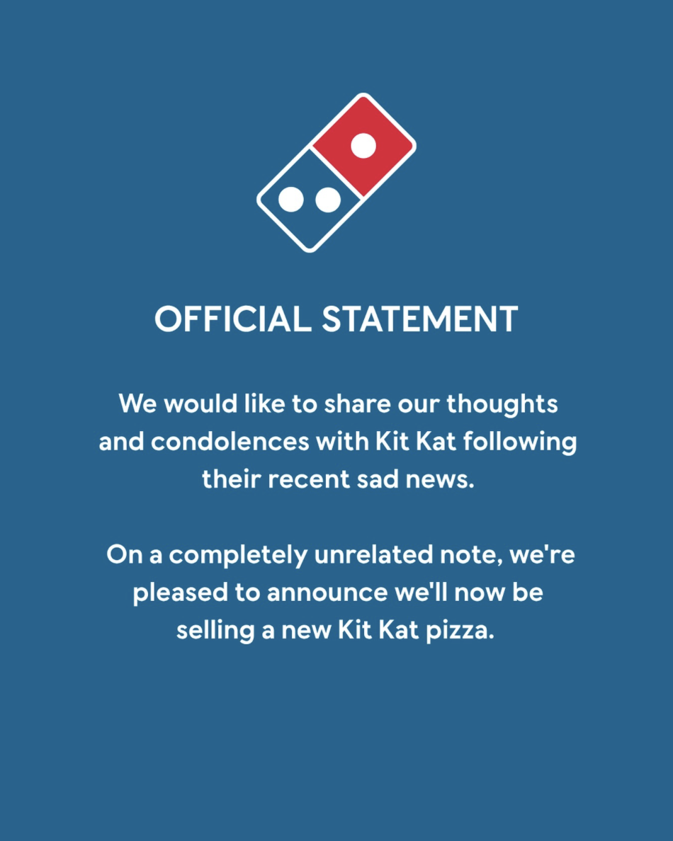Who: Nestlé, the parent company of KitKat, along with creative agency VML, and responding brands including Domino's UK, Durex Singapore, Pizza Hut South Africa, McAfee, Rode, and Barilla.