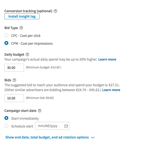 Then comes the Bid Management, and LinkedIn offers the possibility to bid CPC or CPM. You can also introduce a Daily Budget and you can define an ad rotation with optimization for CTR. Do not forget to implement the Conversion Tracking if you want to optimize for conversions.
