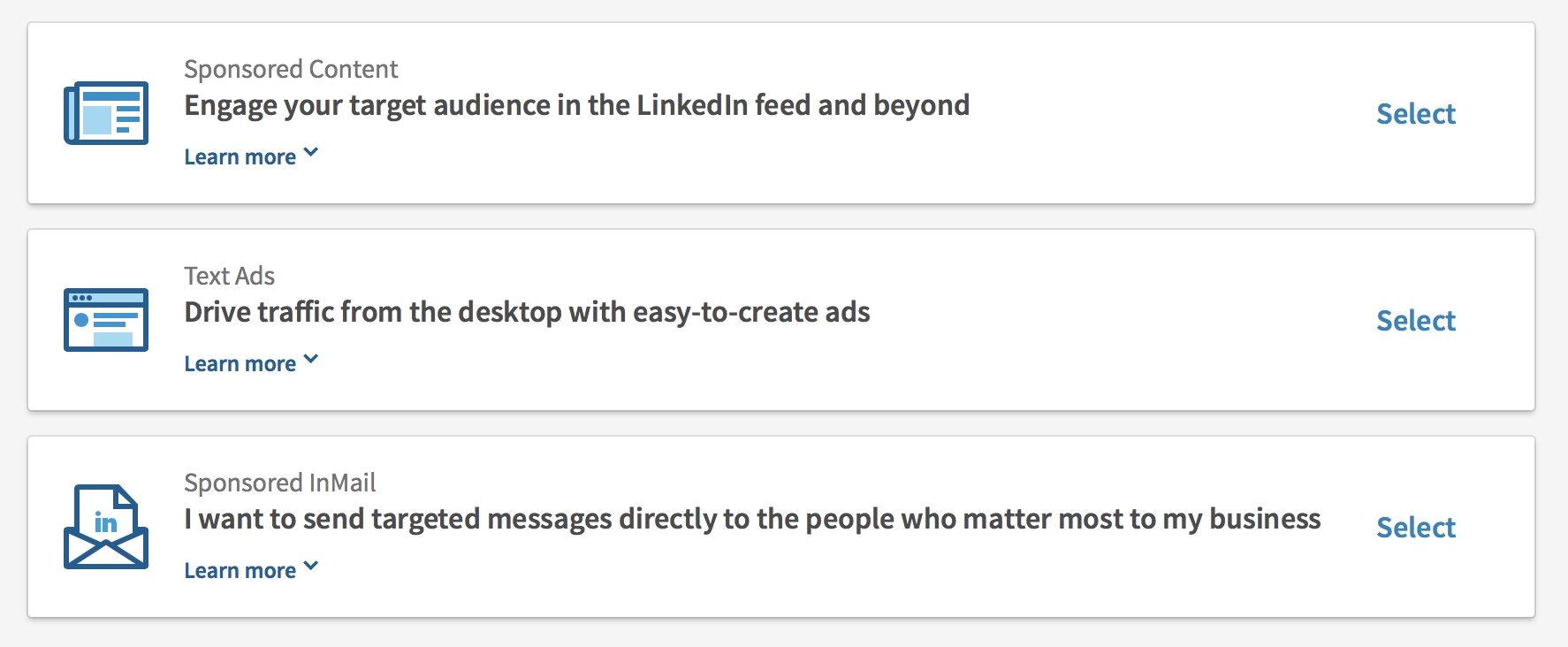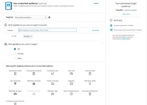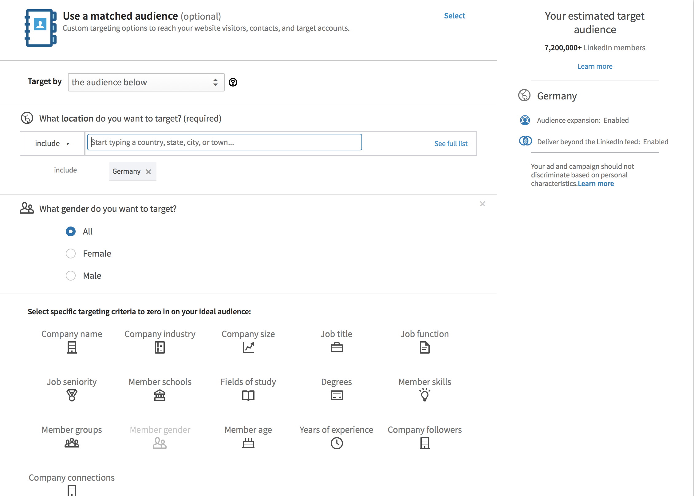 Here comes the most interesting feature. Now you can target your users with the LinkedIn targetings that include Geotargeting, Company name, Company industry, Company size, Job title, Job function, Job seniority, Member schools, Fields of study, Degrees, Member skills, Member groups, Member gender, Member age, Years of experience, Company followers, Company connections, Audiences.