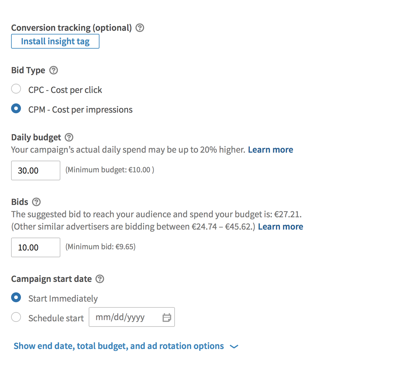 Then comes the Bid Management, and LinkedIn offers the possibility to bid CPC or CPM. You can also introduce a Daily Budget and you can define an ad rotation with optimization for CTR. Do not forget to implement the Conversion Tracking if you want to optimize for conversions.