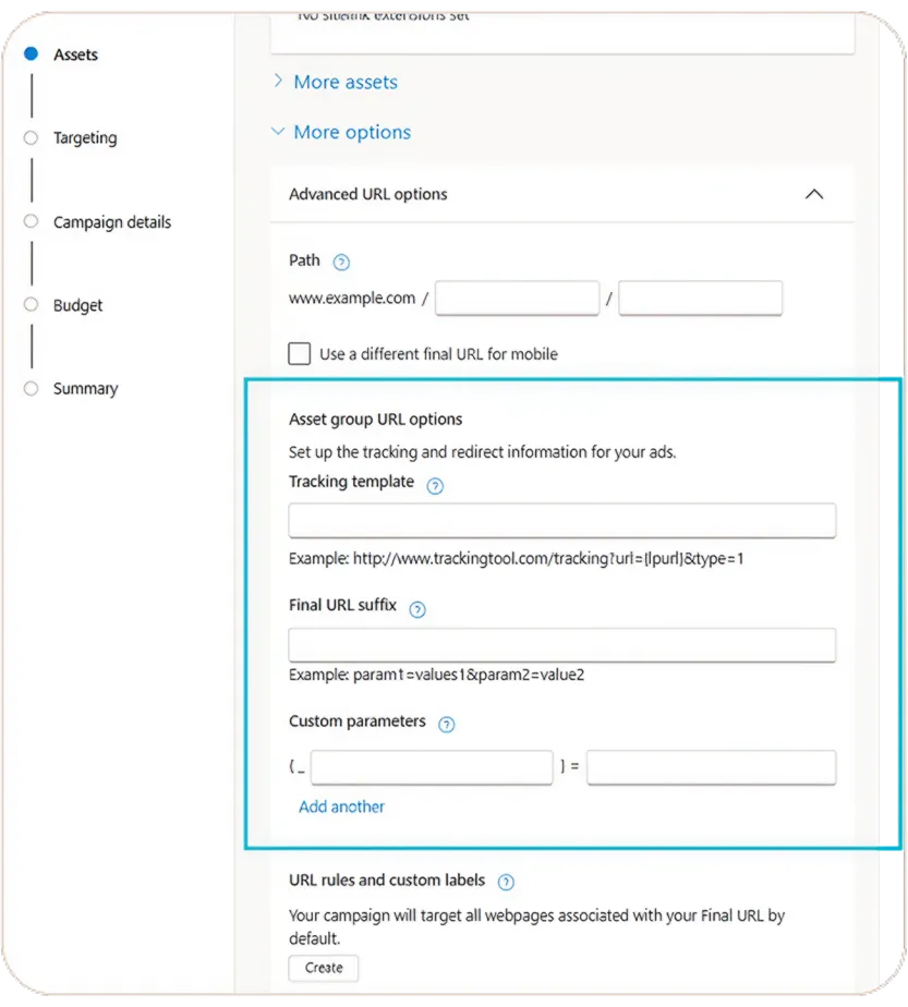 Custom parameters provide additional flexibility by allowing advertisers to define arbitrary key-value pairs appended to tracking templates. These parameters enable sophisticated attribution schemes where different asset groups pass distinct identifiers to landing pages or analytics systems for detailed performance analysis.
