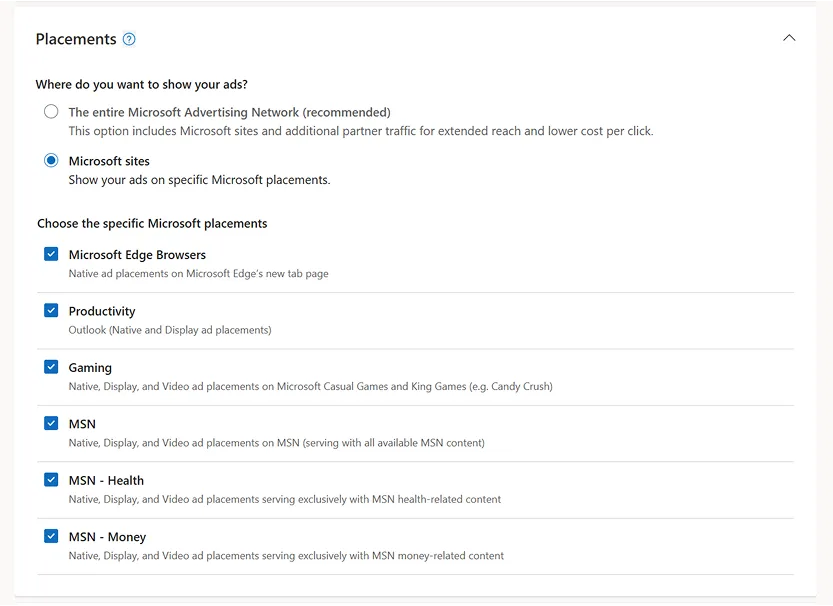 Placement targeting enables advertisers to serve ads exclusively on premium Microsoft properties including MSN, Outlook, Microsoft Casual Games, and Microsoft Edge browser placements. This option restricts ad delivery to Microsoft-owned inventory, providing controlled brand-safe environments for advertisement placements without exposure to external partner sites.