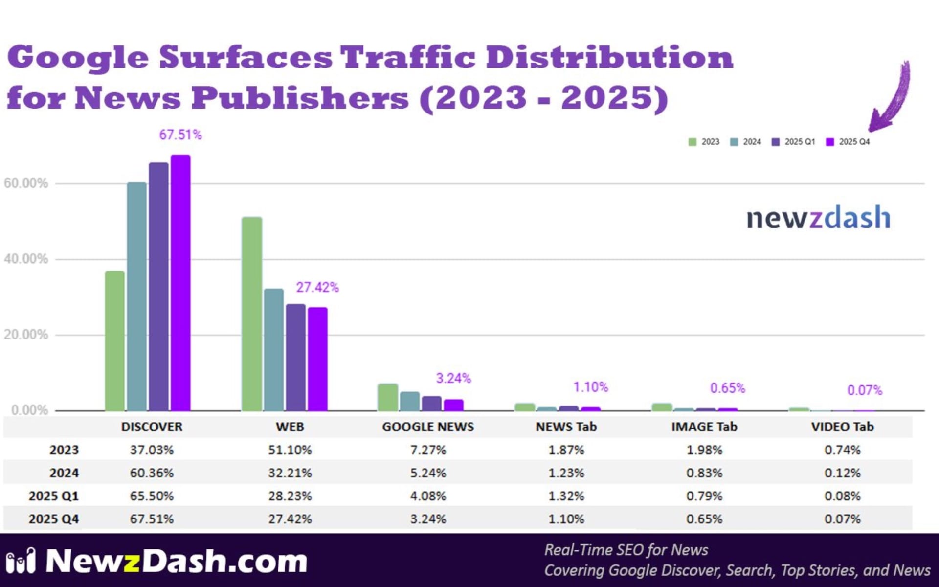- Q4 2025: Discover hits 67.51% while Web Search falls to 27.42%, with NewzDash analysis covering 400 publishers confirming the shift announced December 23