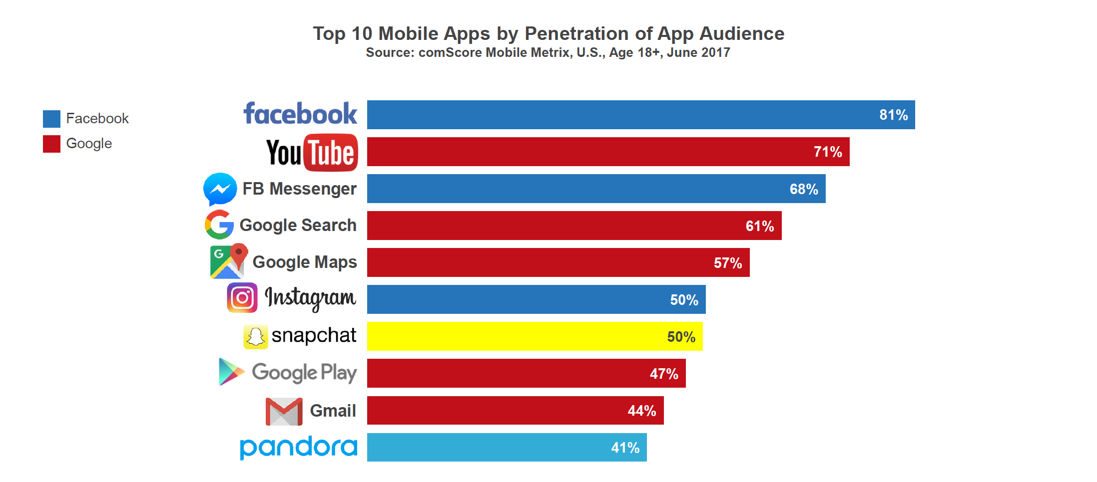 The top Apps on the USA belong to Google and to Facebook. Facebook is the first app with more penetration, 81%. Youtube has 71% penetration. Facebook Messenger has 68% penetration. Google Search has 61% penetration. Google Maps has 57% penetration. See here the top 10 Apps: