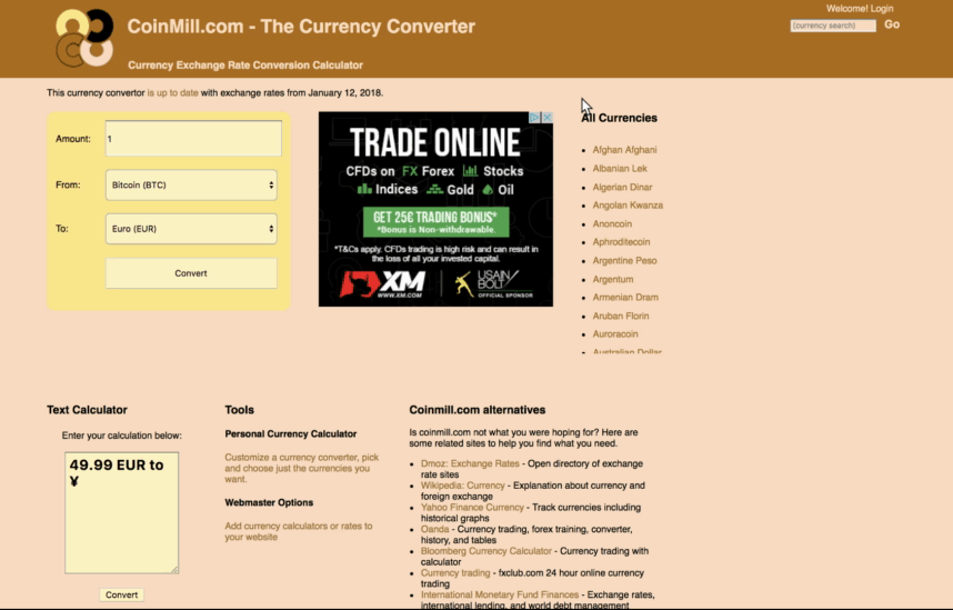 CoinMill is a currency converter where users can convert bitcoin in dollars or euros or in other coins. The perfect site to get the today bitcoin price. bitcoin usd / bitcoin eur, etc.