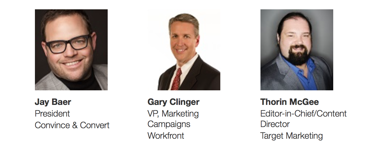 On Wednesday, December 13, 2017, at 2:00 PM ET/11:00 AM PT, Jay Baer, President at Convince & Convert, Gary Clinger, VP, Marketing Campaigns at Workfront, and Thorin McGee, Editor-in-Chief/Content Director at Target Marketing, are giving a free webinar of 1 hour about 5 Ways CMOs can prove value.